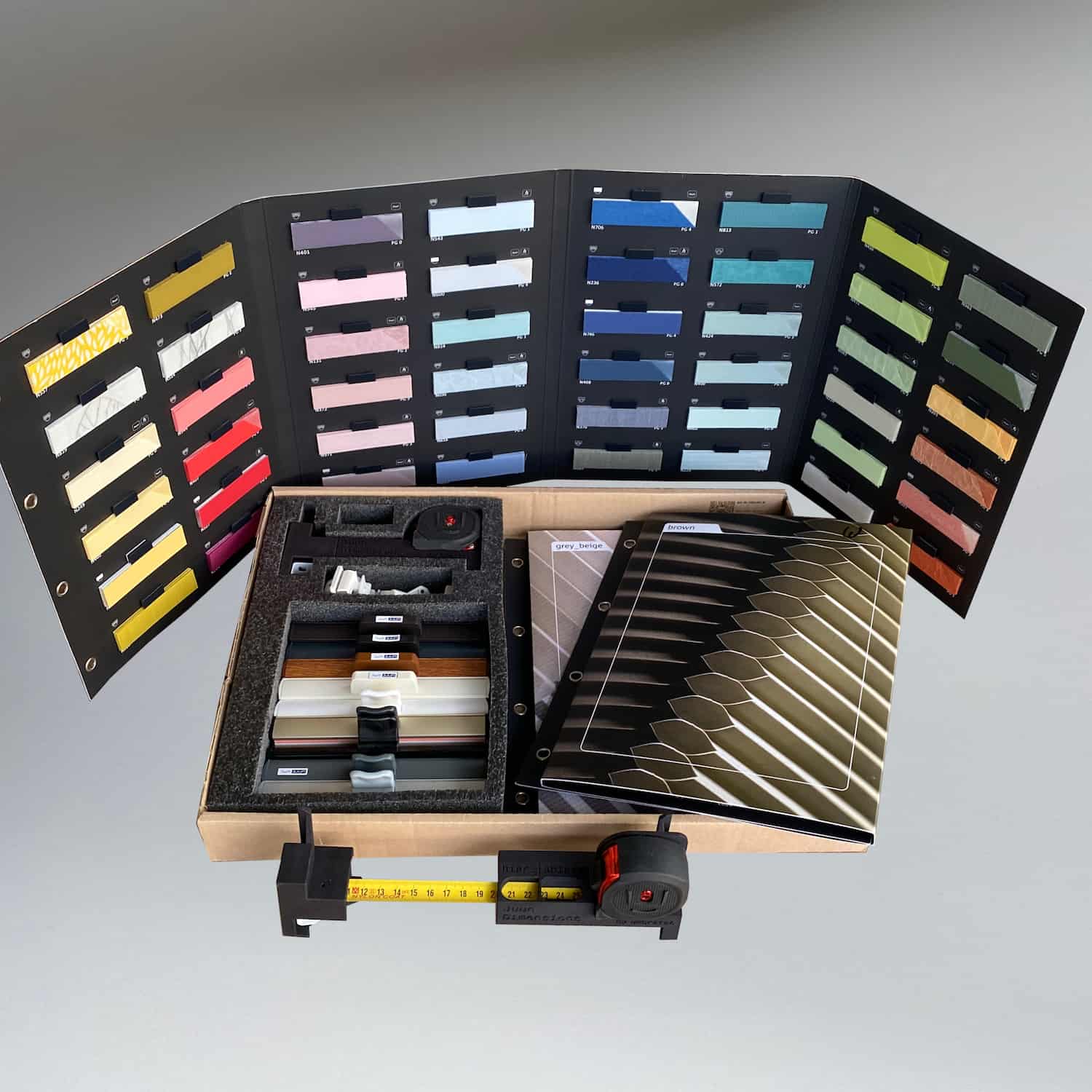 Wähle aus den Farbkategorien zwei Kataloge mit bis zu 96 Stoffmustern aus, die Deinen Vorstellungen entsprechen. Wir schicken Dir diese Kataloge zusammen mit unserem Juun-Dimension Tool zu. Außerdem kannst Du dir sämtliche Halter ansehen. Damit kannst Du Zuhause Deinen Stoff auswählen und Deine Fenster einfach ausmessen. Bitte schicke die Box innerhalb von 10 Tagen wieder versandkostenfrei zurück.